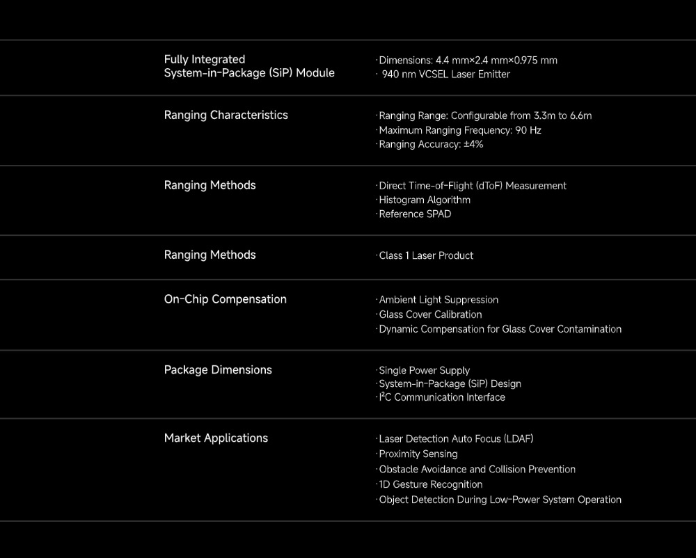 The VI5301 direct Time-of-Flight (dToF) sensor features a single-module package design, integrating a Single-Photon Avalanche Diode (SPAD) receiving array and a VCSEL laser transmitter. Capable of performing accurate distance measurement on objects without being affected by their color, reflectivity, and texture, this sensor provides a compact solution for miniature ToF sensing in the market. Leveraging independently developed SPAD and proprietary ToF acquisition and processing technology, the VI5301 can achieve accurate distance measurement of up to 6.6 meters, with a fast ranging frequency of up to 150 Hz.
