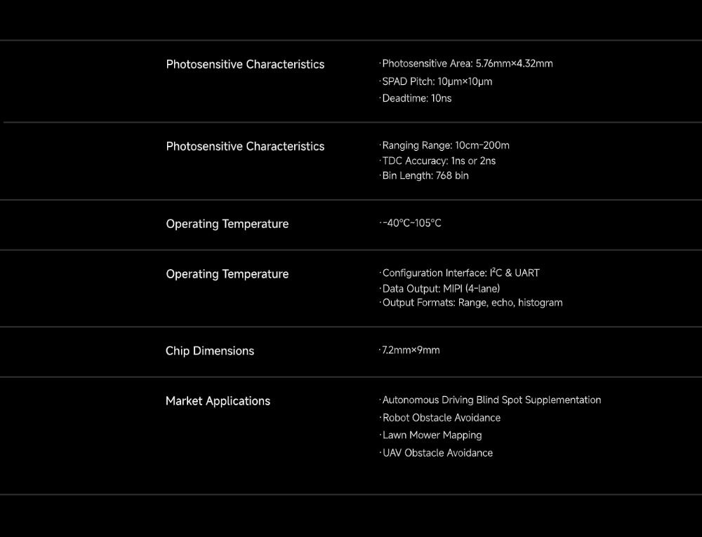 The VR9150 is a highly integrated Time-of-Flight (ToF) depth sensor based on a Single-Photon Avalanche Diode (SPAD) array. Through the collaborative design of the SPAD array, multi-channel Time-to-Digital Converters (TDCs), and an intelligent DSP, it systematically addresses the four core bottlenecks of traditional ToF sensors.