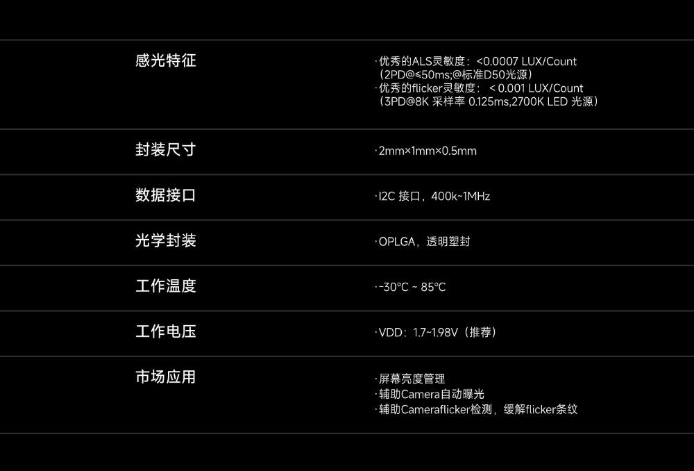 VI1250具有环境光感应和闪烁检测功能。该器件采用L2.0mm×W1.0mm×H0.5mm透明封装。VI1250内置视觉函数通道以及IR通道。可以精确地测量环境光强度,适用于屏下OLED,LCD等屏幕亮度管理,Camera的自动曝光补偿VI1250同时支持环境光闪烁检测功能。最高可以支持10kHz闪烁检测(20kHz采样频率),同时内置ALC环境光抑制,可以支持在室外强光场量下检测光源闪烁(AC/DC=1/10000)。