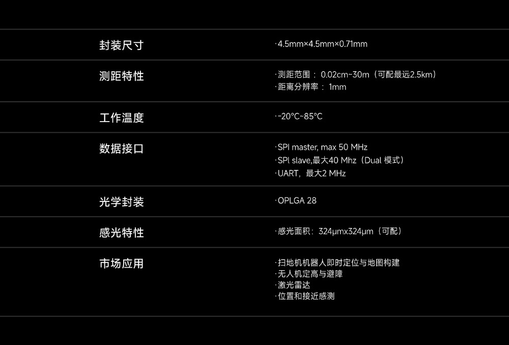 VI4303 是一款基于直接飞行时间(d-ToF)激光测距SoC。该传感器为市场上的微型ToF传感器提供了一种紧凑的解决方案。利用自主研发的SPAD(单光子雪崩二极管)和独特的ToF采集与处理技术,VI4303可实现最高2.5千米的精确距离测量。测量数据及系统配置信息通过SPI接口进行传输。