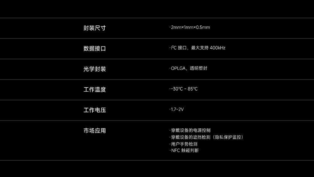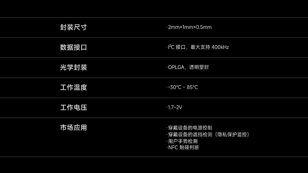 VI1301是一个具有极小封装尺寸2mm×1mm×0.5mm 的接近光传感器,传感器里集成了基于工厂校准的 940nm VCSEL和 PS 芯片。PS 芯片通过 PD 检测从物体表面返回的 VCSEL光强弱并转为 Pdata,基于 Pdata 强弱实现接近和远离判断。VI1301 芯片内部集成了 VCSEL和 PS 两颗芯片。与此同时,芯片支持 Crosstalk 以及环境光补偿功能,使其具有出色的接近检测。VI1301 内部集成了温度校准单元,同时支持待机和睡眠的低功耗模式。此外,芯片内部集成Near,Far两颗 PD,可以适配丰富的应用场景为电子设备提供了出色的电源控制管理。