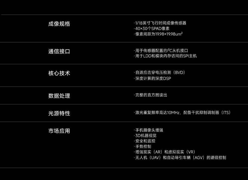 VA6320是一款集成了全局快门40x30 SPAD(单光子雪崩光电二极管)像素阵列、前端时间到数字转换器和深度DSP处理器的1/18英寸ToF(飞行时间)成像传感器。配合脉冲激光发射器,该传感器可以生成一个40×30的深度图像。该传感器提供支持直方图模式和DSP模式数据格式的MIPI CSI-2接口。使用CSI-2单通道接口,传感器能够以全分辨率每秒30帧的速度进行图像传输。传感器内部包含一个微处理器(MCU),用于实现软件补丁和增强系统的可编程性。此外,它还集成了一个照明控制器和一个SPI接口,允许配置ToF模块中的下游LDD(激光二极管驱动器),使传感器能够直接访问模块内存(如EEPROM或Flash)中的校准数据和固件代码。