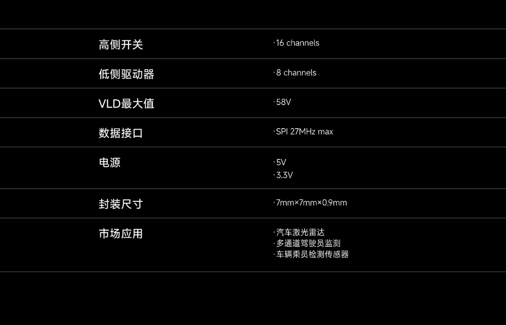 VD0201一个集成的纳秒脉冲驱动器,驱动激光二极管(VCSEL和EEL阵列),集成具有16个高边开关,8个低侧栅极驱动器,8个数字控制延迟线(DCDL)。驱动程序提供了一个SPI配置寄存器接口,触发接口接收系统触发信号。6个热传感器检测高侧开关和低侧栅极驱动器,以及16个高侧开关短路探测器从ERR_INT引脚发送警报,从SPI接口发送详细信息。