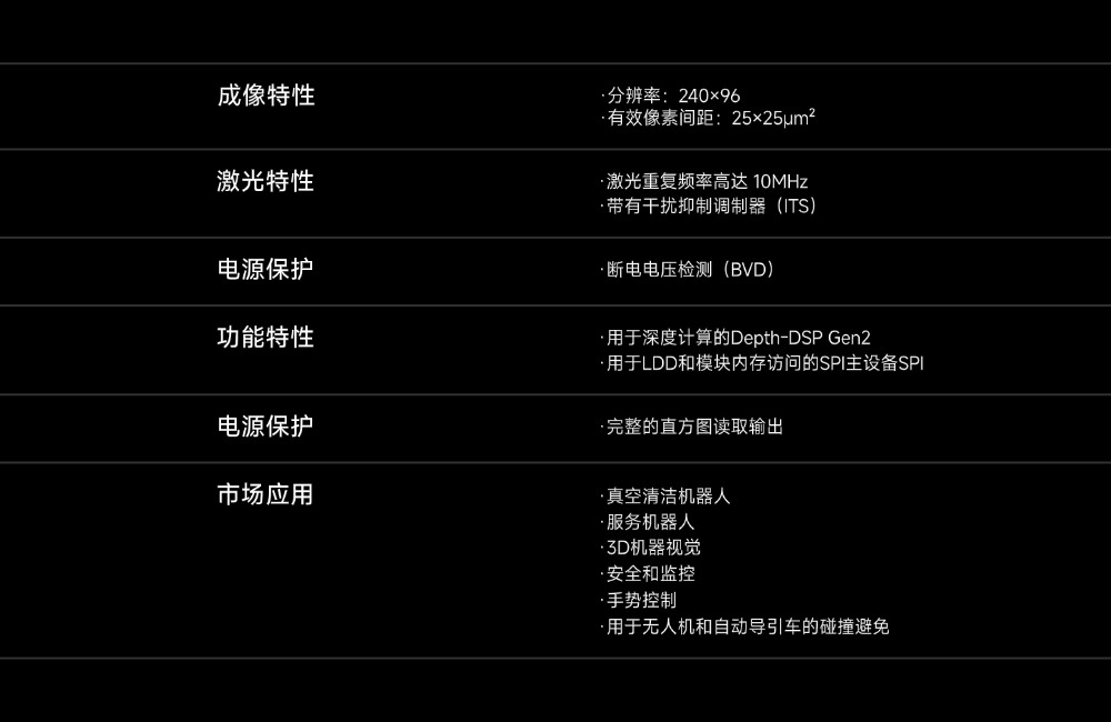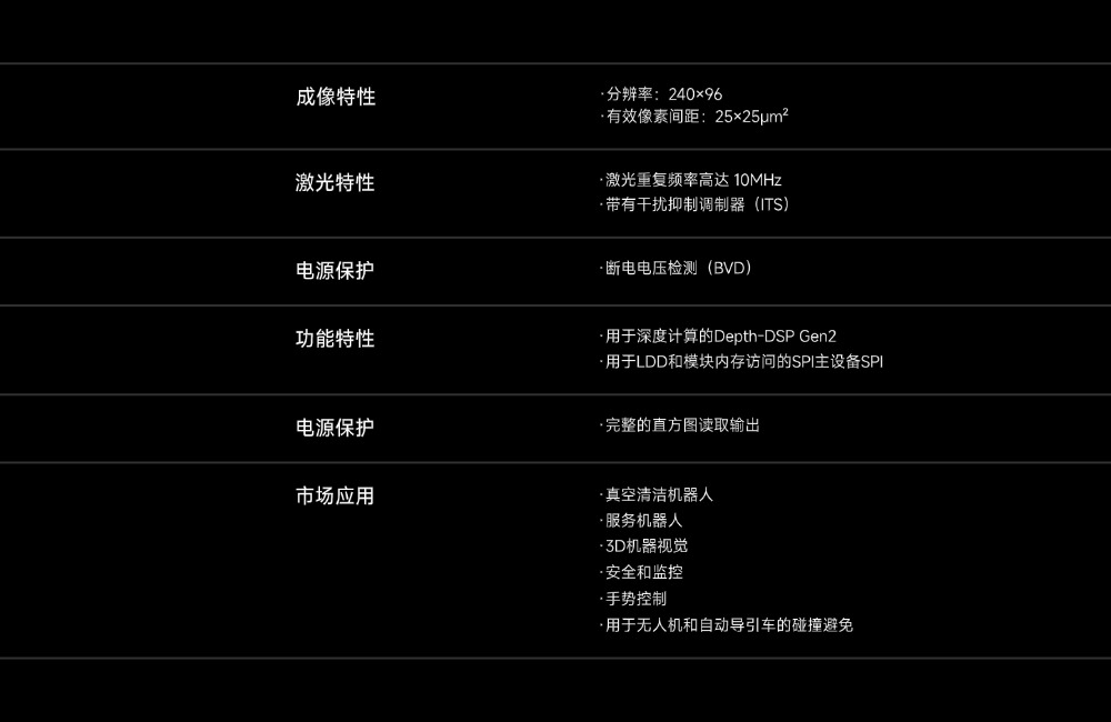 VI4331是一种直接飞行时间(ToF)成像传感器,集成了240x96个单光子雪崩光电二极管(SPAD)像素阵列、前端时间数字转换器(TDC)和深度DSP处理器。通过脉冲激光发射器的组合,该传感器可以返回一个240x96的深度图像。该传感器提供支持直方图模式和DSP模式像素数据格式的MIPI CSI-2接口。此外,它还集成了一个照明控制器和四个激光触发器,以支持多达四个照明通道的可寻址VCSEL设置。该传感器包含一个微控制器(MCU),用于实现软件补丁和增强传感器的可编程性。它还集成了一个SPI接口,允许在ToF系统中配置下游激光二极管驱动器(LDD),并允许传感器直接访问模块内存(如EEPROM或Flash)上的模块校准数据和固件代码。