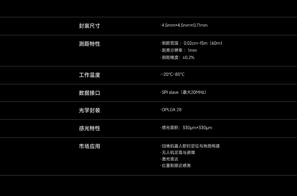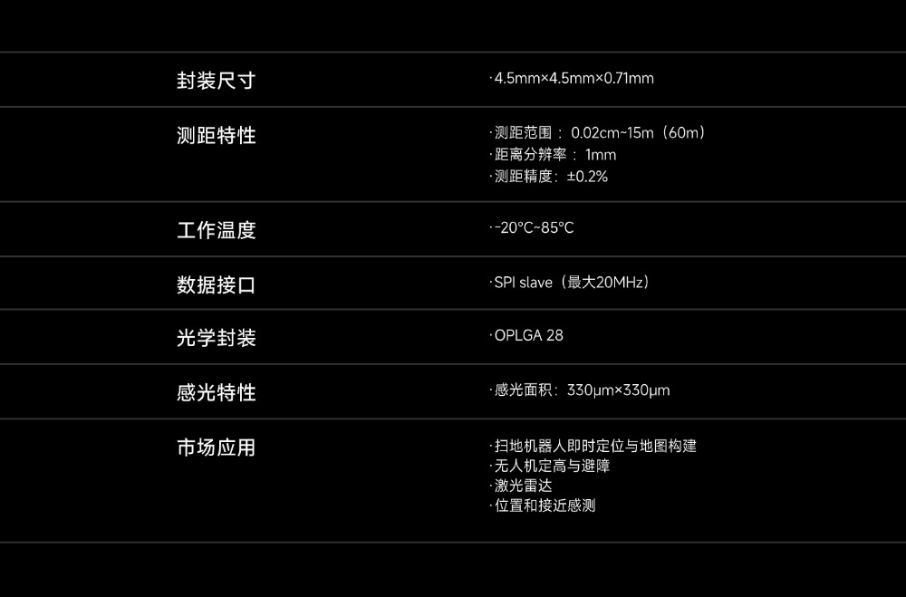 VI4302是一款基于SPAD光电转换器件实现测距功能的SoC芯片,具有单电源低功耗系统、高性能测距、高稳定性以及兼容性等优势,可针对激光雷达点云质量以及回充站识别、玻璃门误撞等痛点场景提供高集成度、高性价比的解决方案。适用于扫地机器人、服务机器人、无人机等多个领域。